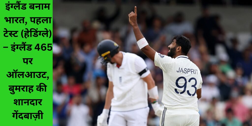 इंग्लैंड बनाम भारत, पहला टेस्ट (हेडिंग्ले) – इंग्लैंड 465 पर ऑलआउट, बुमराह की शानदार गेंदबाज़ी, भारत को 6 रन की बढ़त(Ind vs Eng 1st test 2025,Day 3 England 465 run par allout,Jasprit Bumrah ki shandar bolling,india ko 6 run ki barat)