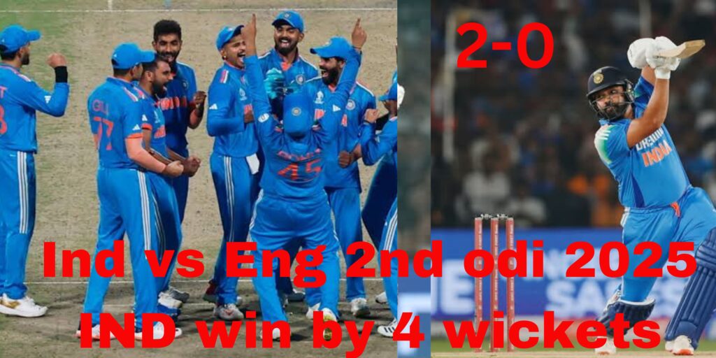 भारतीय क्रिकेट टीम ने कटक के बाराबाती स्टेडियम में खेले गए दूसरे वनडे मैच में इंग्लैंड को 4 विकेट से हराकर तीन मैचों की सीरीज में 2-0 की अजेय बढ़त हासिल कर ली है। इंग्लैंड ने पहले बल्लेबाजी करते हुए 304 रन बनाए थे, जिसके जवाब में भारत ने 49 ओवरों में 6 विकेट खोकर लक्ष्य हासिल कर लिया।