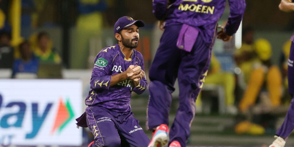 कोलकाता के गेंदबाजों ने शुरुआत से ही दबाव बना दिया। सबसे पहले मोईन अली ने डेवोन कॉनवे को आउट कर CSK की नींव हिला दी। उन्होंने 4 ओवर में 1 विकेट लेकर एक मेडन ओवर डाला और सिर्फ 20 रन दिए। इसके बाद स्पिन जुड़वां – सुनील नारायण और वरुण चक्रवर्ती – ने कमाल कर दिखाया।