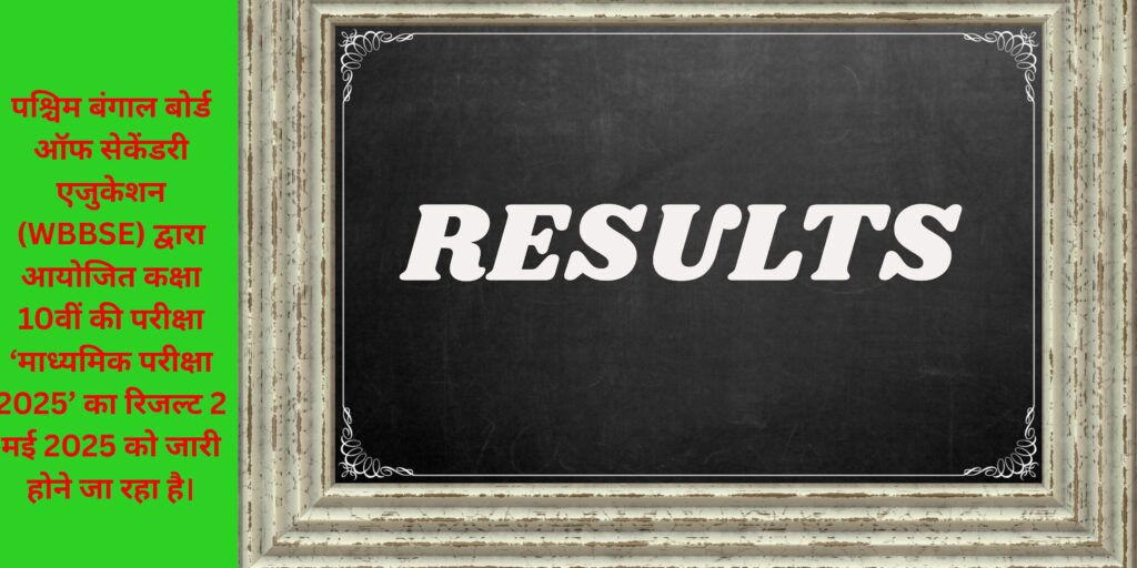 पश्चिम बंगाल बोर्ड ऑफ सेकेंडरी एजुकेशन (WBBSE) द्वारा आयोजित कक्षा 10वीं की परीक्षा ‘माध्यमिक परीक्षा 2025’ का रिजल्ट 2 मई 2025 को जारी होने जा रहा है। इस वर्ष करीब 9 लाख से अधिक छात्रों ने परीक्षा दी थी, जो 10 फरवरी से 22 फरवरी 2025 तक राज्यभर के 2,683 परीक्षा केंद्रों पर आयोजित की गई थी।